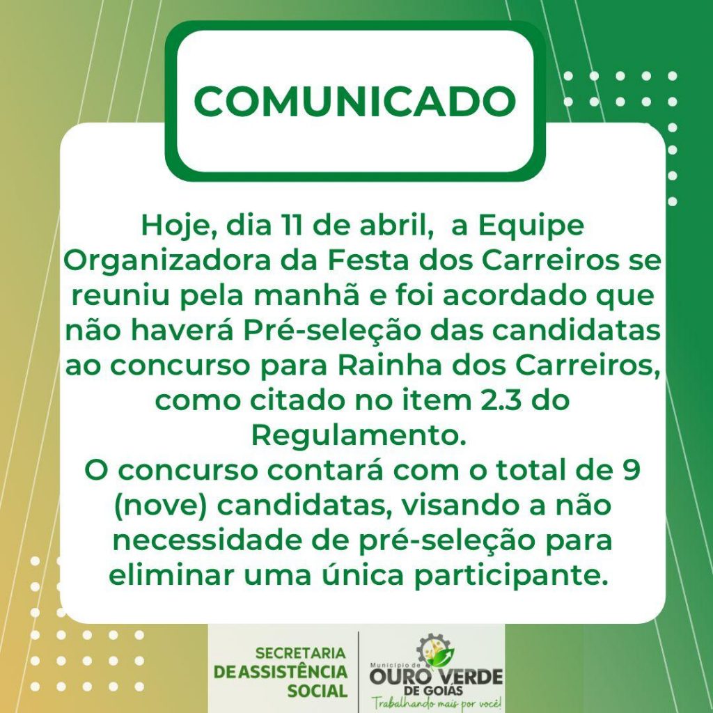 O Município de Ouro Verde de Goiás – GO torna público para conhecimento de todos os interessados a abertura de inscrições de CONCURSO PARA ESCOLHA DA RAINHA E PRINCESA DA FESTA DOS CARREIROS DE OURO VERDE DE GOIÁS 2022, a partir do dia 01 á 08 de Abril de 2022.